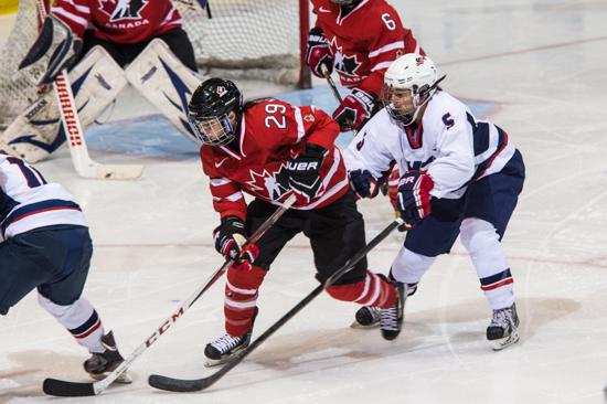 Canada pulled ahead at 5:18 of the second period when Victoria Bach received a long outlet pass and broke in alone, tucking the puck past U.S. netminder Erin O'Neil (Minnetonka, Minn.). Despite outshooting Canada, 12-6, the period ended with Canada ahead by a 2-1 count.